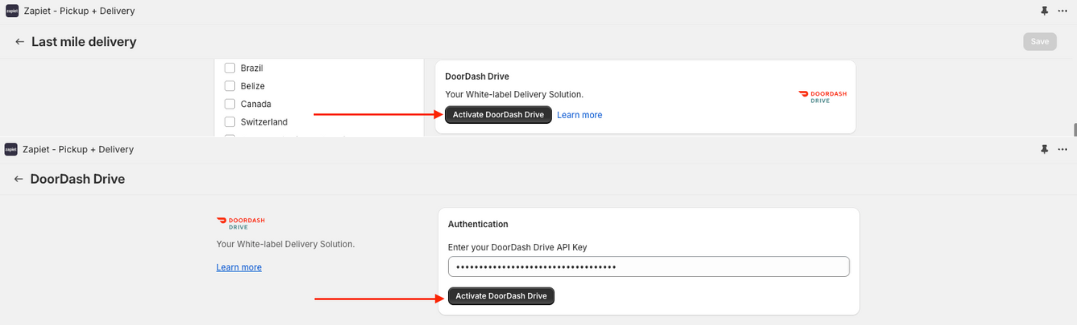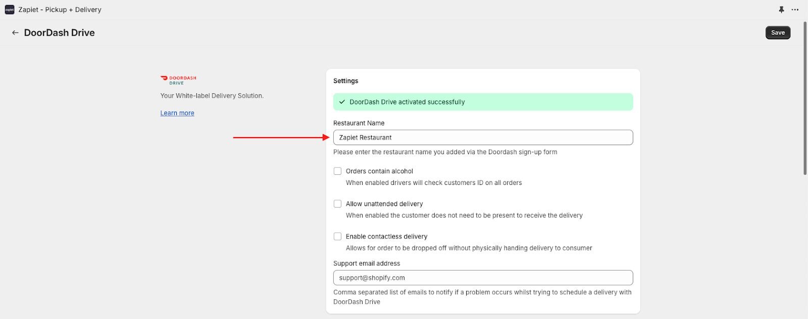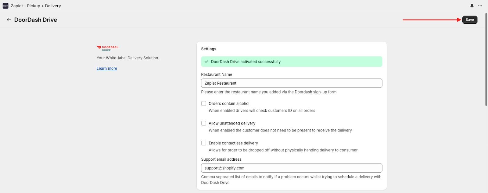 DoorDash Drive has now been activated—to finish setting up, you need to configure your settings: set your delivery zones, fees, and preferences for DoorDash deliveries within Zapiet.
