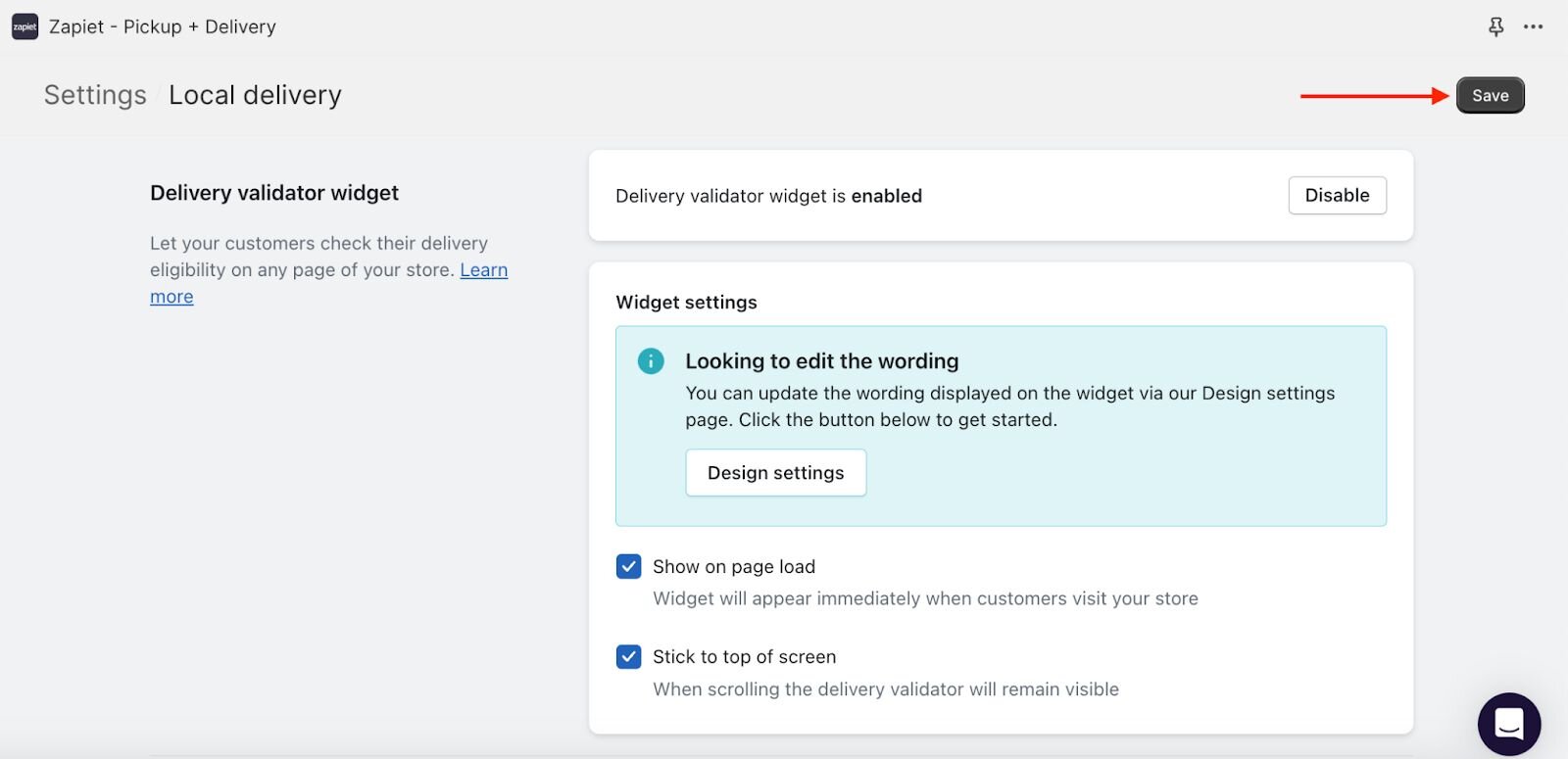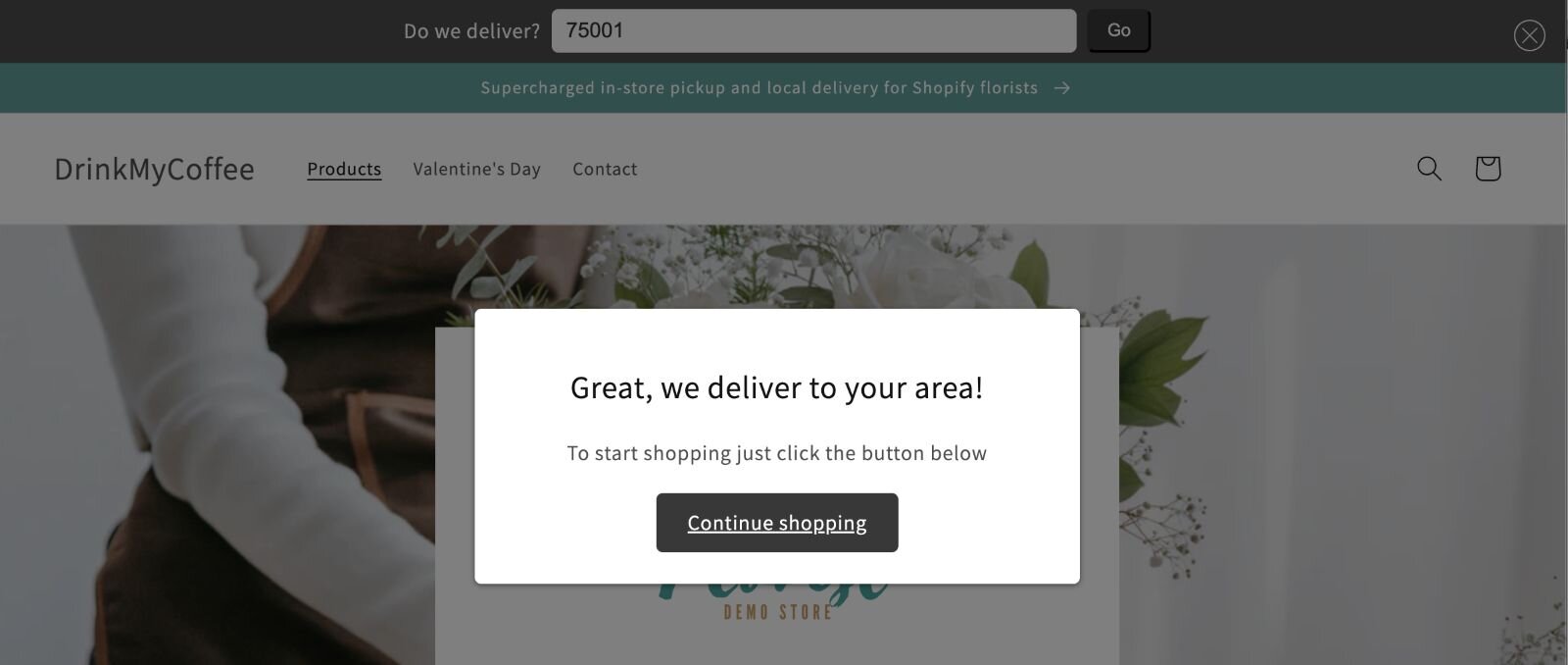 You can also set up the delivery validation widget to show when customers first enter your store, or it can also appear on every page of your store. It asks the customers to validate their postal code or address before the cart page to see if delivery is available for their area.