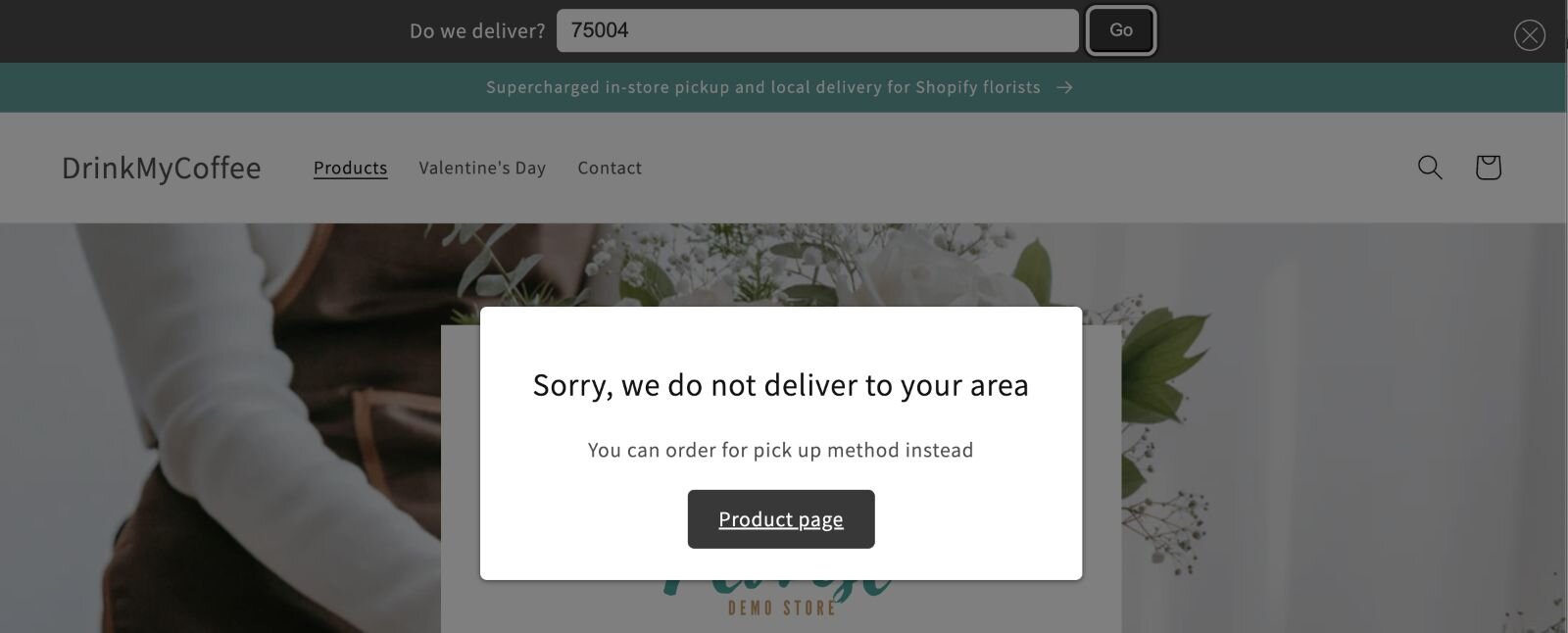 Let’s imagine you’re running a small bakery in the US and delivering locally. In this case, you can set up delivery validation to certain postal codes or withing a certain radius and add the delivery validation widget to your website. Your customers will be able to check if their address matches your store delivery area to find out if they are eligible for delivery. If the address is valid, your customer can then be redirected to the product page or cart, if not, they will be advised they can’t order delivery. The message is customisable, and you can redirect them to order for pick up instead.