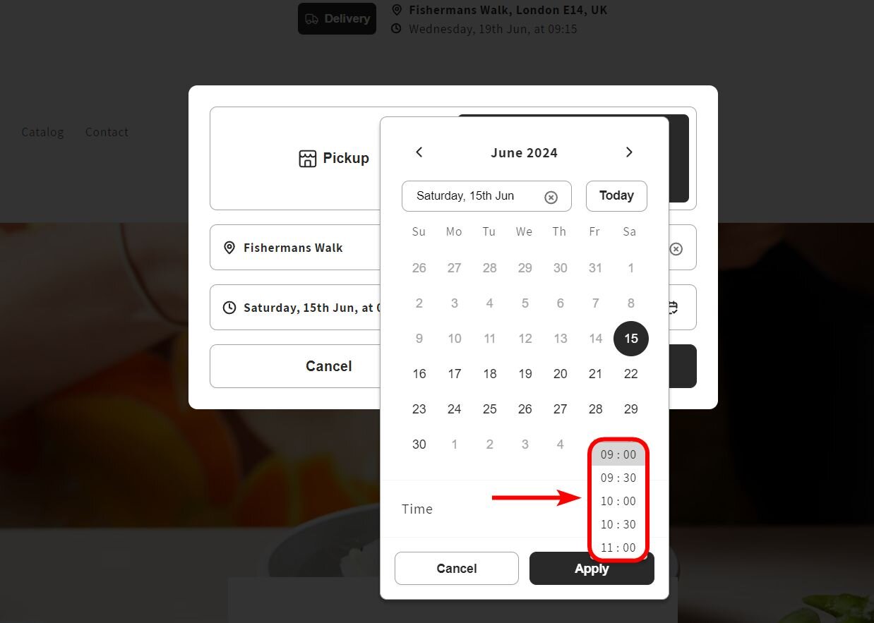 The estimated delivery time will be reflected in the time picker in our widget. The first slot available will be the current time + the delivery time.