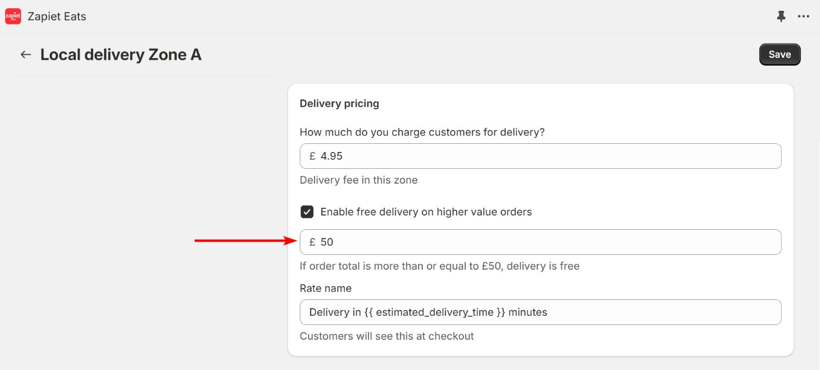 With this option, you can build an upsell strategy by charging a delivery fee for orders below £50 and offering free delivery for orders with higher values.