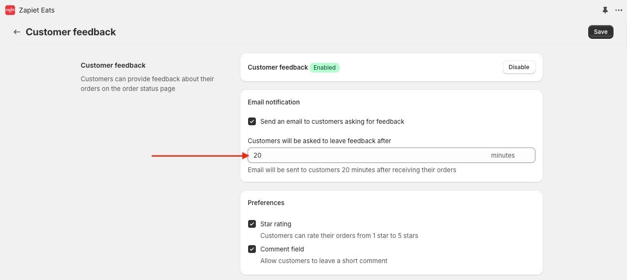 With Zapiet Eats, you can set an estimated delivery time, which is 20 minutes by default. However, you can adjust this upwards or downwards depending on how busy your kitchen is, to align with your customers’ expectations.